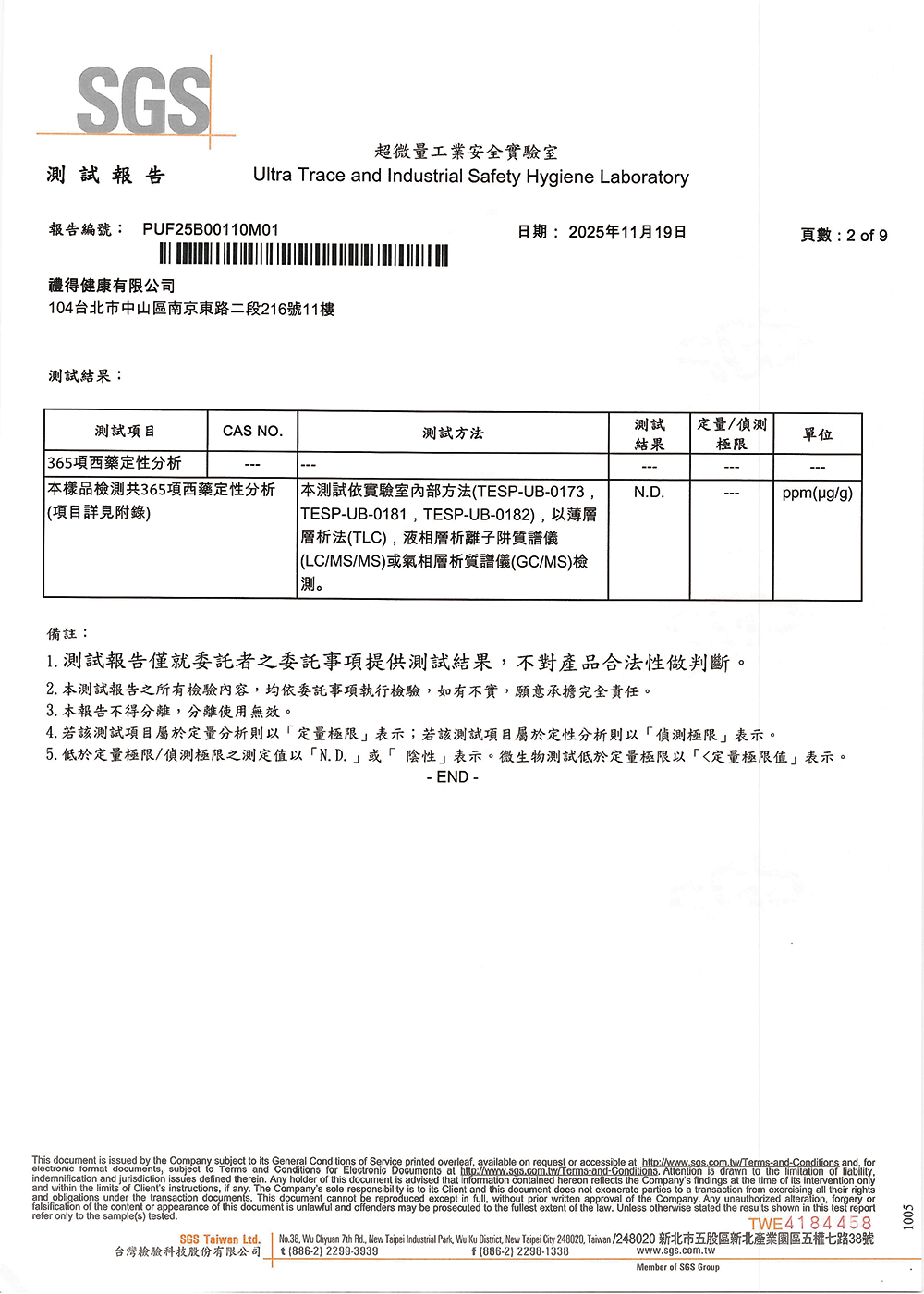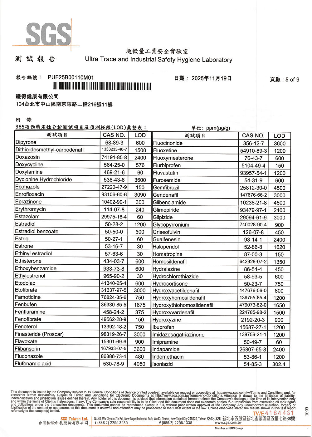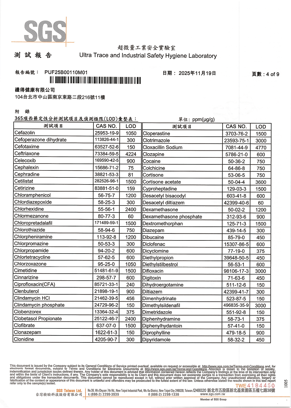 不含西藥成份檢測:365項常見西藥成份均未檢出
