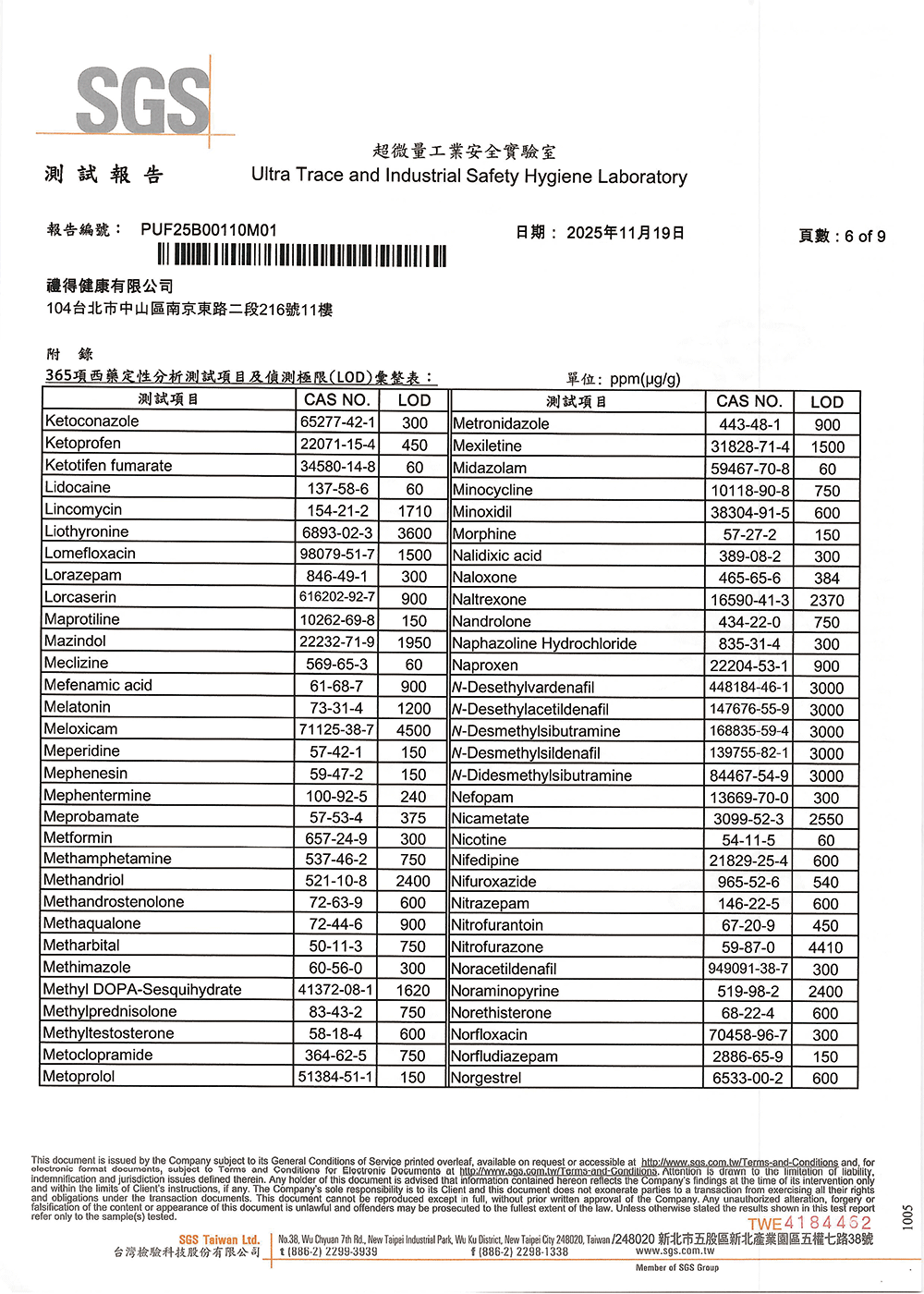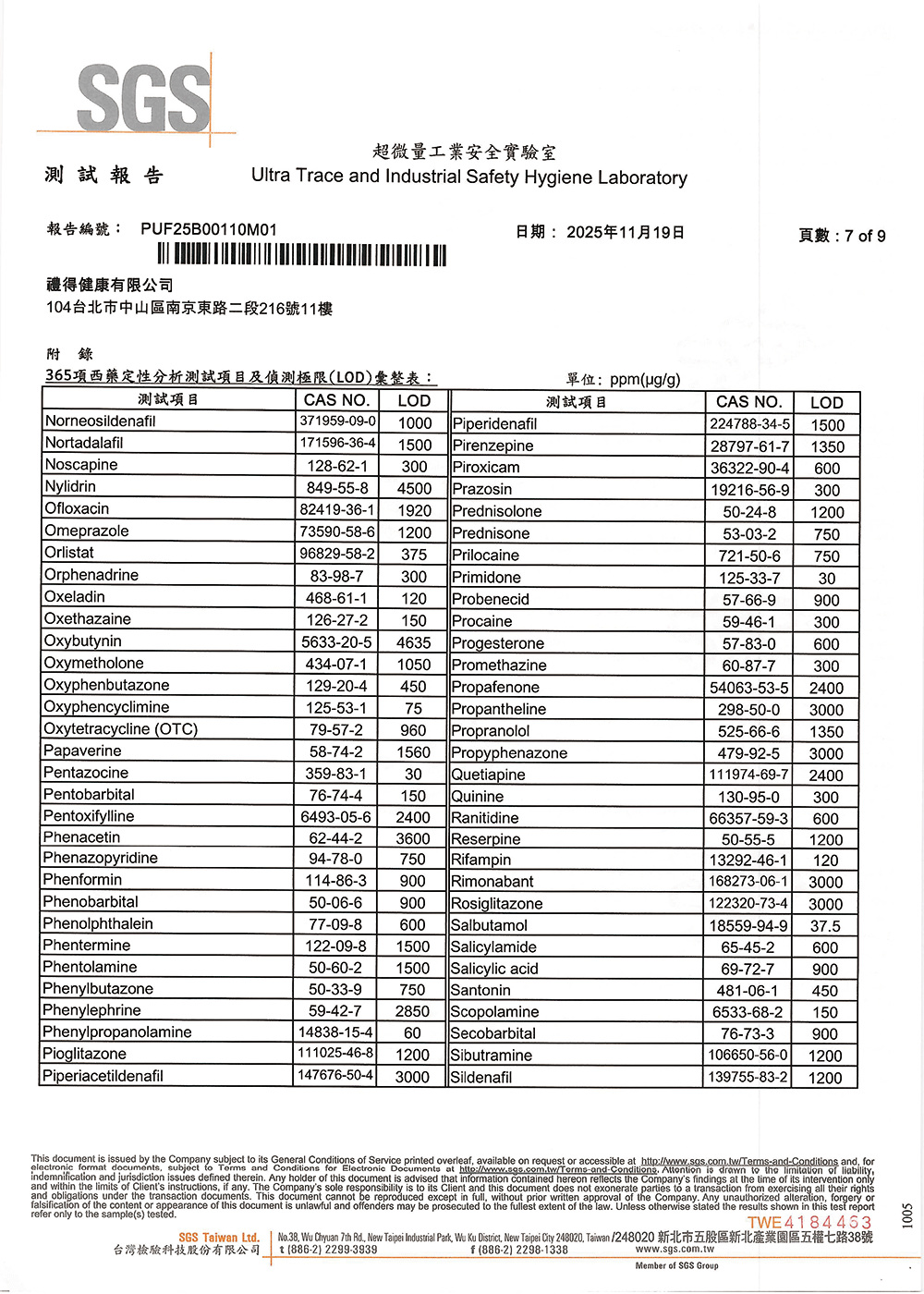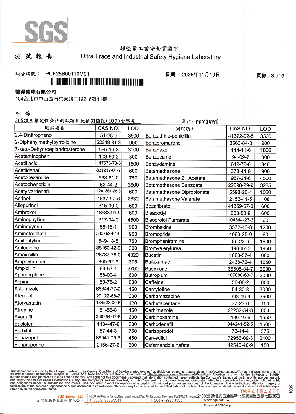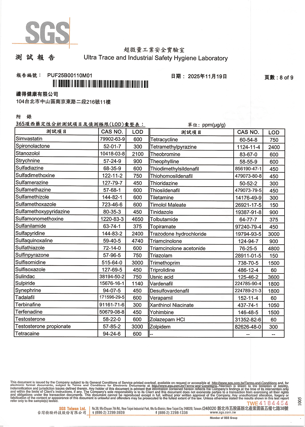 不含西藥成份檢測:365項常見西藥成份均未檢出