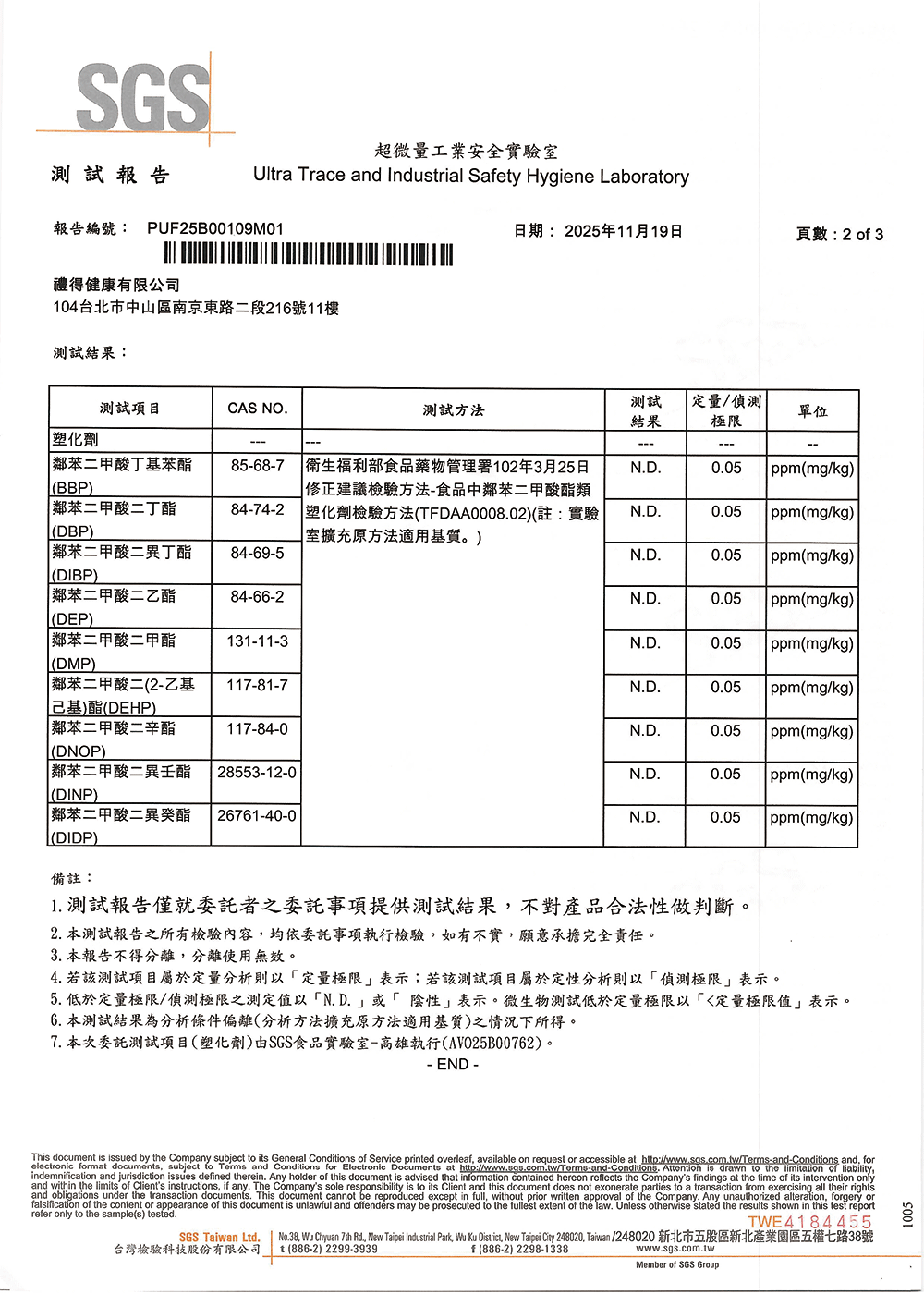 檢測項目包含:鄰苯二甲酸丁基苯酯 (BBP)、鄰苯二甲酸二丁酯 (DBP)、鄰苯二甲酸 二異丁酯 (DIBP)、鄰苯二甲酸 二已酯 (DEP)、鄰苯二甲酸 二甲酯 (DMP)、鄰苯二甲酸二 (2-乙基己基)酯 (DEHP)、鄰苯二甲酸二辛酯 (DNOP)、鄰苯二甲酸二異壬酯 (DINP)、鄰苯二甲酸二異癸酯 (DIDP)。