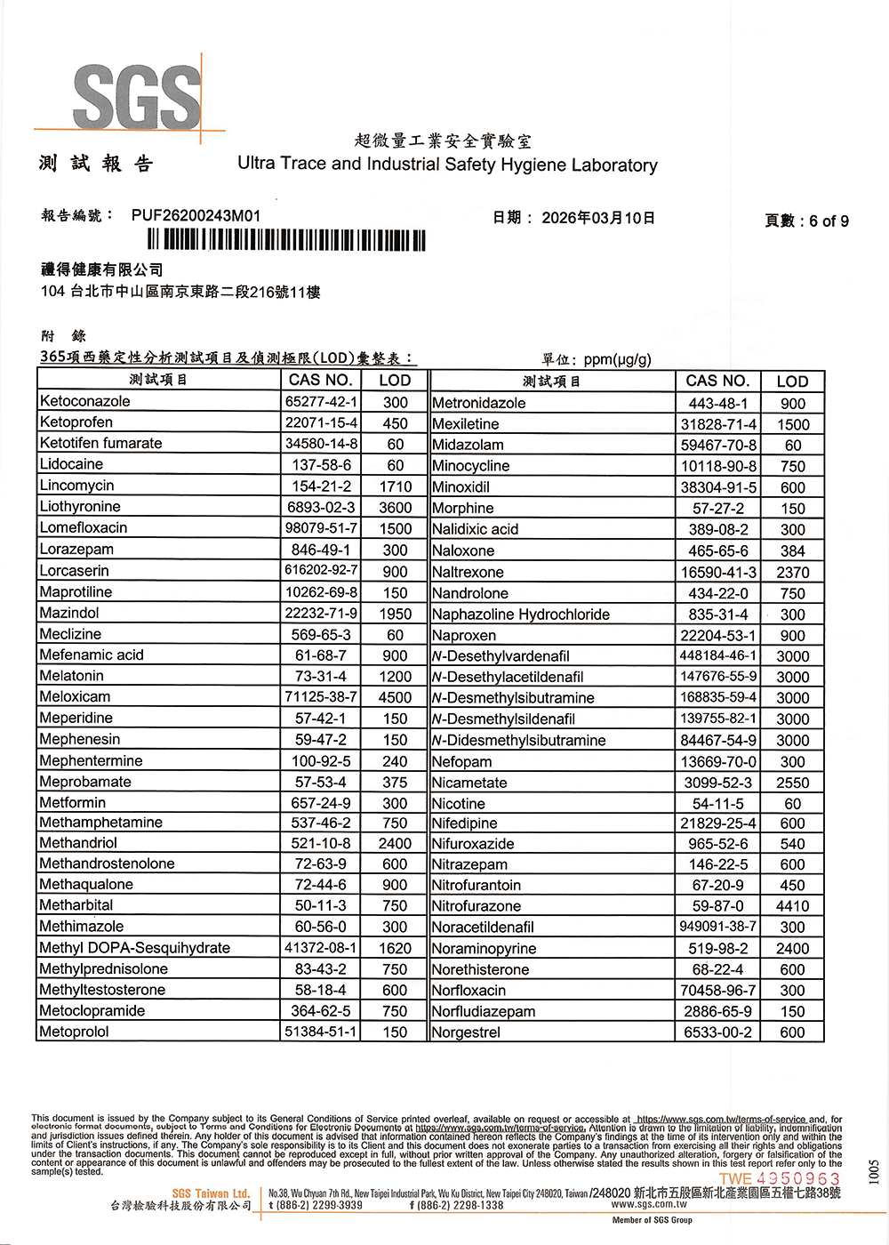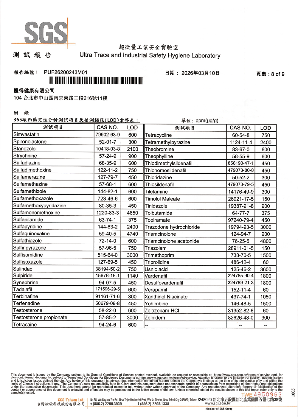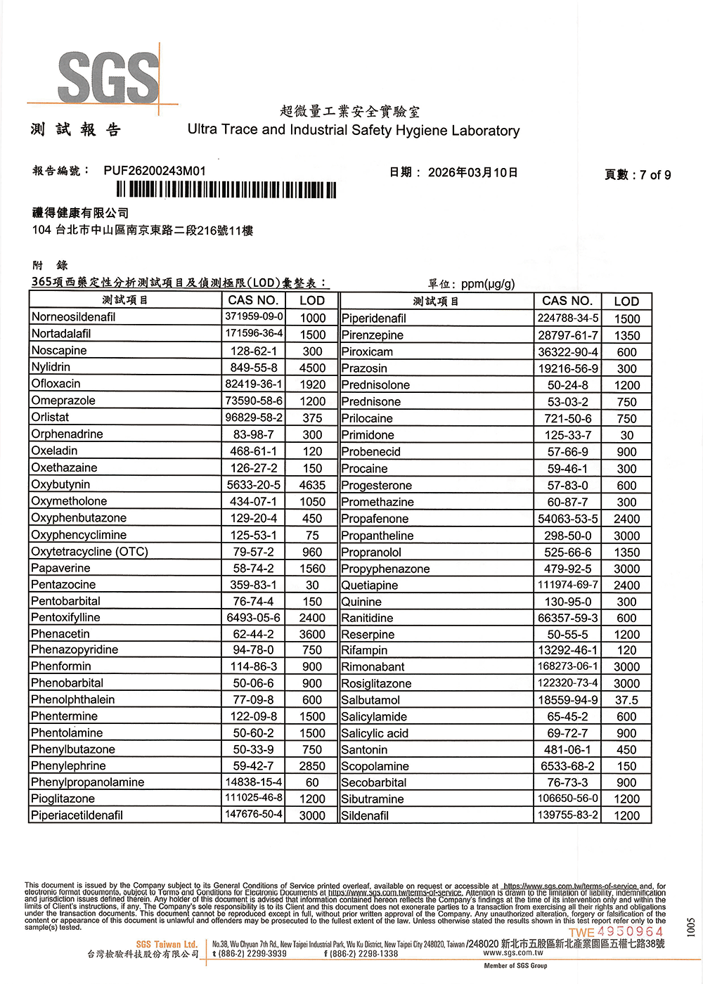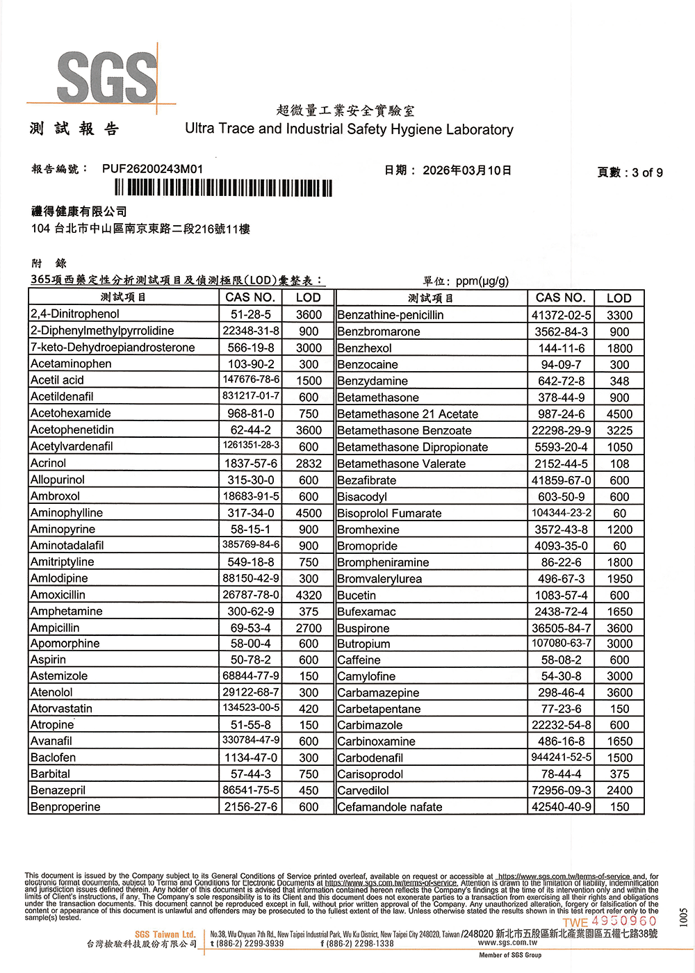 不含西藥成份檢測:365項常見西藥成份均未檢出