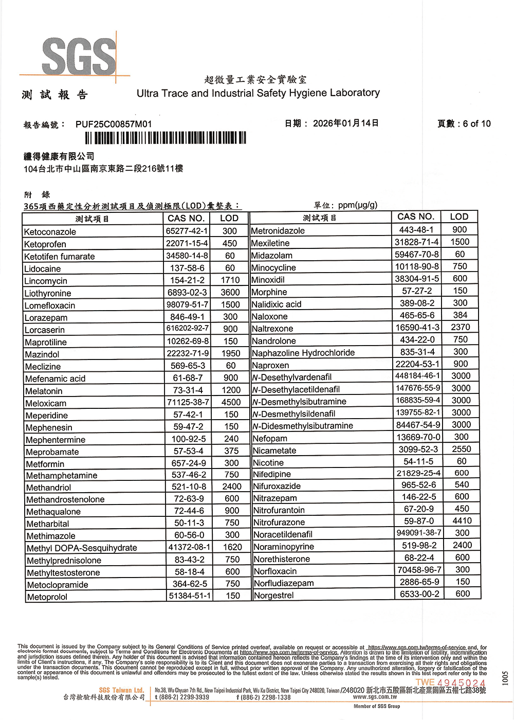 檢測項目包含:補腎滋養、減肥、解熱止痛劑、鎮咳怯痰劑、抗組織胺類、類固醇類、肌肉鬆弛劑、支氣管擴張劑、局部麻醉類、腸胃類用藥、糖尿病用藥、心臟血管用藥、降血脂用藥、降血壓用藥、治甲狀腺機能缺陷、泌尿系統用藥、抗生素類、精神用藥、神經興奮劑、荷爾蒙類、其他用藥。