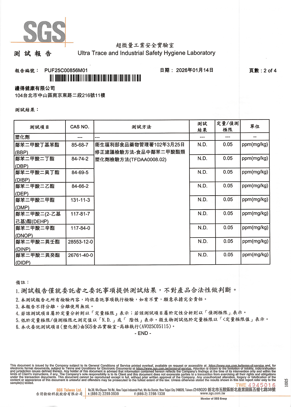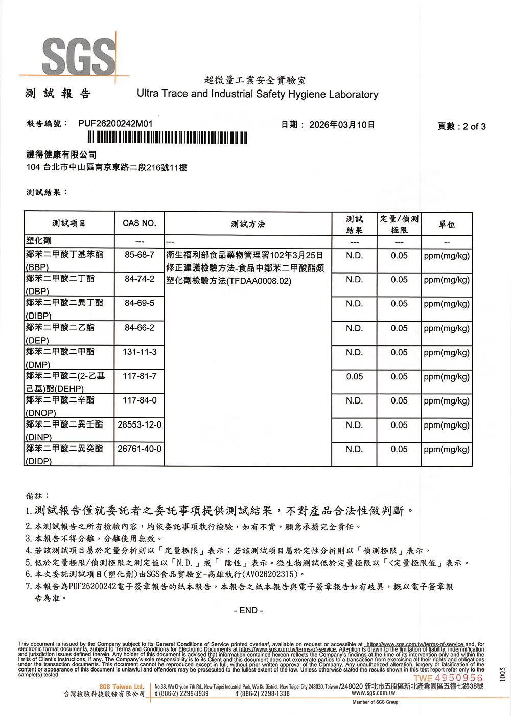 檢測項目包含:鄰苯二甲酸丁基苯酯 (BBP)、鄰苯二甲酸二丁酯 (DBP)、鄰苯二甲酸 二異丁酯 (DIBP)、鄰苯二甲酸 二已酯 (DEP)、鄰苯二甲酸 二甲酯 (DMP)、鄰苯二甲酸二 (2-乙基己基)酯 (DEHP)、鄰苯二甲酸二辛酯 (DNOP)、鄰苯二甲酸二異壬酯 (DINP)、鄰苯二甲酸二異癸酯 (DIDP)。